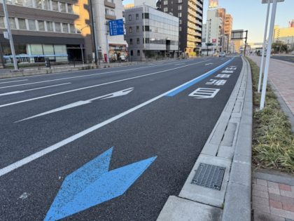 大きな交通量の多い道路に青いペンキで書いただけの